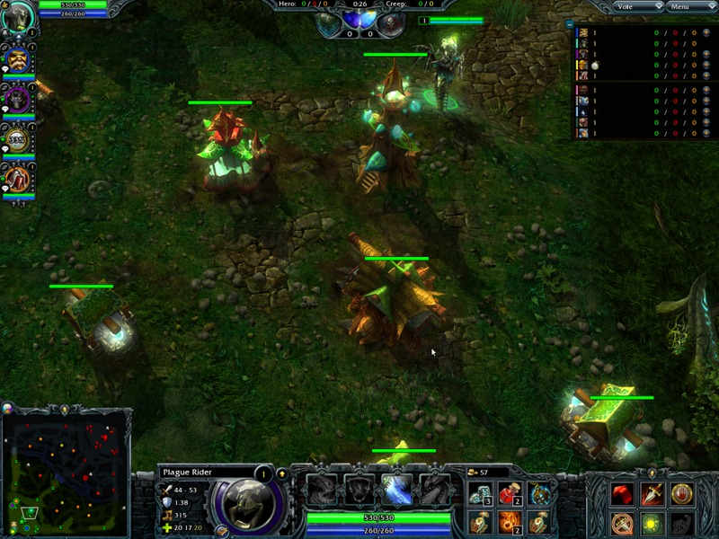 One of the nicest things about HoN is it has Mac, Windows, and Linux native versions. This is very convenient for me since I primarily run the Ubuntu Linux operating system. The game is not particularly demanding in terms of hardware requirements. My system generally runs it well at maximum settings on a single 1600×1200 resolution monitor, although I do have to be careful to stop any resource-intensive background tasks, such as file indexing, or media library rescans before playing. For reference, my system specs are as follows: Intel Core i5 model 650 CPU on H55 chipset, 16GB DDR3-1333 RAM, nVidia GeForce GTX 550 Ti graphics, Intel X25-M 160GB SSD primary storage.