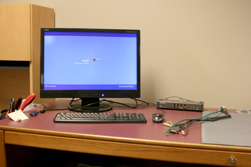It's relatively common for power users and those in the IT industry to have two PCs at their desk. One may be a laptop or maybe just an older machine that runs some necessary legacy software or has a lot of data on it that may be difficult and/or time-consuming to migrate to the newer system. Some use a hardware KVM (Keyboard, Video, Mouse) switch to change their screen and input device connection from system to system, while others just have a seperate set of peripherals for each machine. Each of those methods has it's own set of advantages and drawbacks, but both methods are conducive to a cluttered desktop and a nonsensically-segregated style of work.