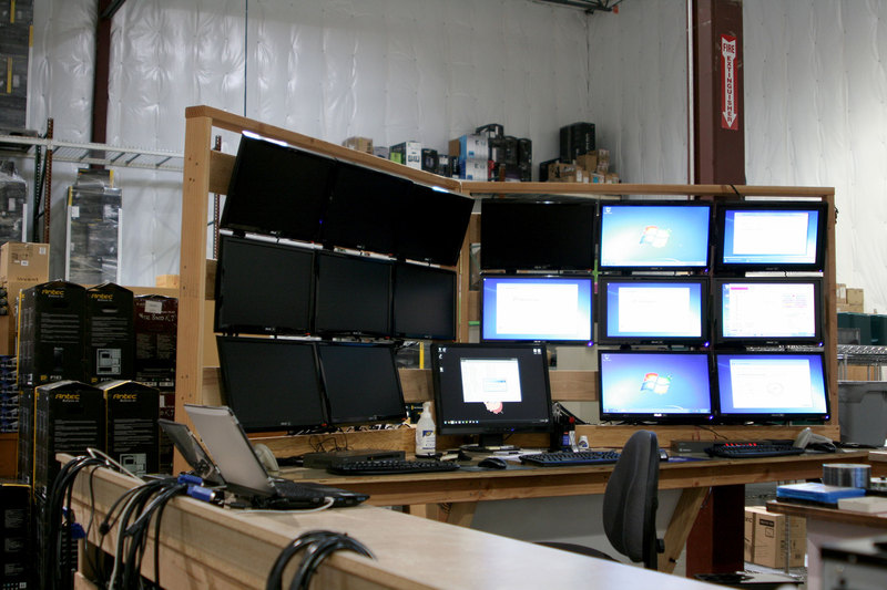 | Here at Puget we use our 'monitor wall' to show the output from up to 16 individual PCs simultaneously. |