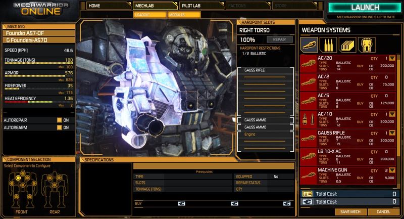 One of my favorite aspects of the MechWarrior series has always been the MechLab – where you can go to customize your mechs to suit your specific style of combat. MWO does not disappoint here, with an interface that stays true to the table top game while enforcing some additional limitations to give each mech and variant a different style. You can change around weapons, armor, engines (which affect speed and turning), heatsinks (which help keep your mech cool and allow you to keep firing longer), and other equipment. Some mechs can mount jump jets, for example, which let you move to higher ground more quickly and allow access to some places that would otherwise be unreachable – like the top of a building. Weapon placement is also a big factor: weapons in arms can be aimed faster, but are then in locations more easily destroyed by opponents. All of the decisions you make about what to do with your mech have to be balanced against the tonnage it can support, space available to mount equipment, hardpoints where you can attach weapons, and of course C-Bills (the in-game currency).