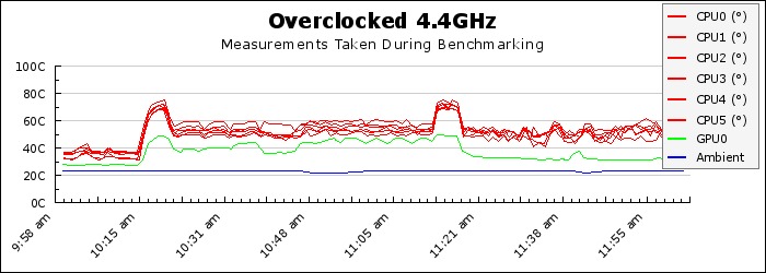 The red lines are the CPU core temperatures, while the green line is the video card. What we see here is that both systems are showing very stable temperatures. The liquid cooled system's video card stays much cooler, but the processors are running a little hotter. This is because all that heat from the video card is included in the same cooling loop at the processors. The non-liquid cooled system has lower CPU temperatures, and while the video card is hotter it's well within an acceptable threshold.