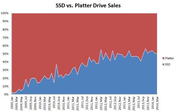 Let's first take a look at how sales of SSDs have stacked up against traditional drives going back five years.