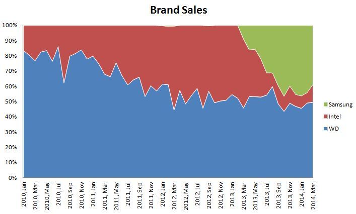It's clear too that Samsung has knocked Intel off the top of the mountain. In fact, this year our four best selling SSDs are built by Samsung. The chart below shows Samsung's dominance since we began offering their SSDs in January of 2013.