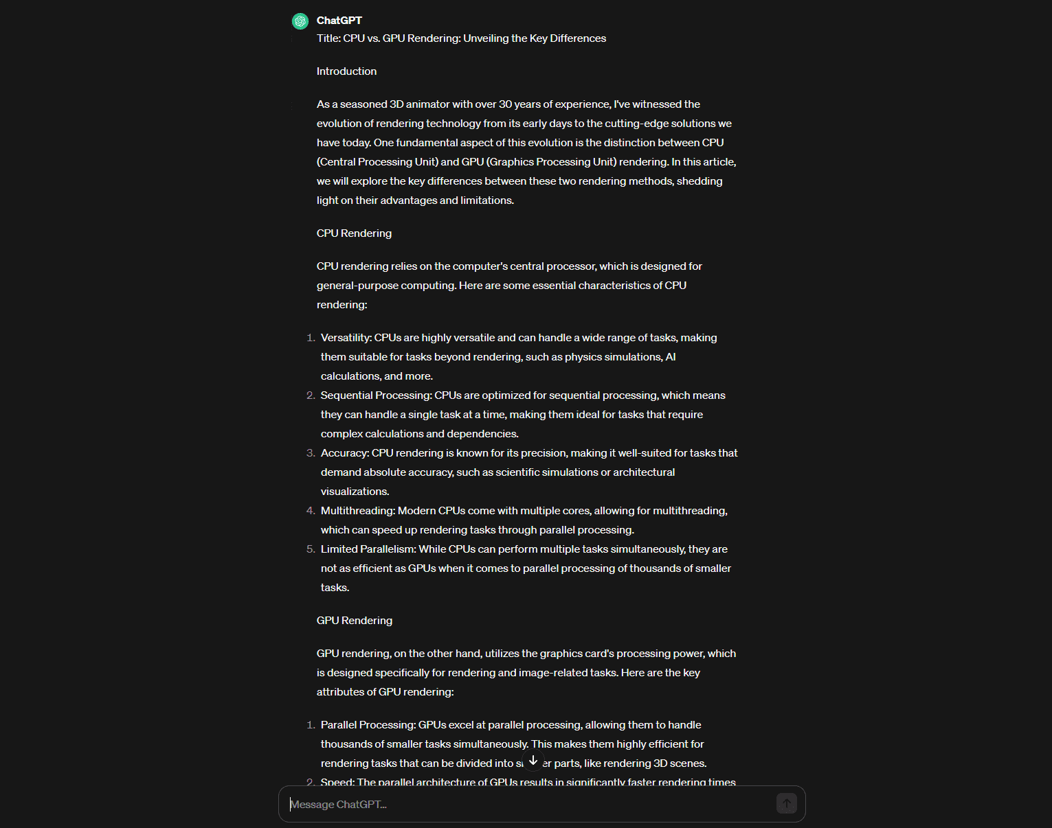I’ve seen it suggested several times to include a sentence along the lines of, “You have 30 years of experience as a {insert profession}”. The intention here is to push the AI to include more detailed information and not just surface level information. However in my testing, it didn’t really provide much more information. I don’t know if this is because the topic at hand, CPU vs GPU rendering, is largely covered by highly knowledgeable people, or that its not covered that often, so the pool of information is not extensive, but detailed.