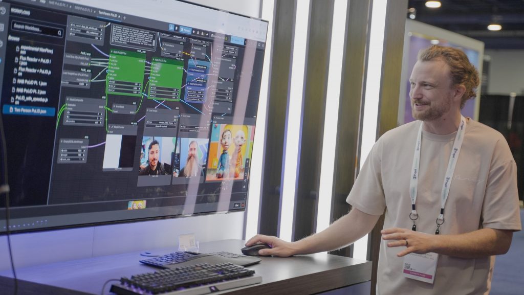 This year, we had the pleasure of hosting Niko Peuringer, Wren Weichman, Nick Laurant, and Christian Fergerstrom of Corridor Digital at our booth. Niko and Nick spent a few hours at our booth walking attendees through utilizing AI tools for VFX. They demonstrated how artists can use ComfyUI for text-to-image, image-to-video, and video-to-audio. Attendees even got to walk away with AI-generated versions of themselves!