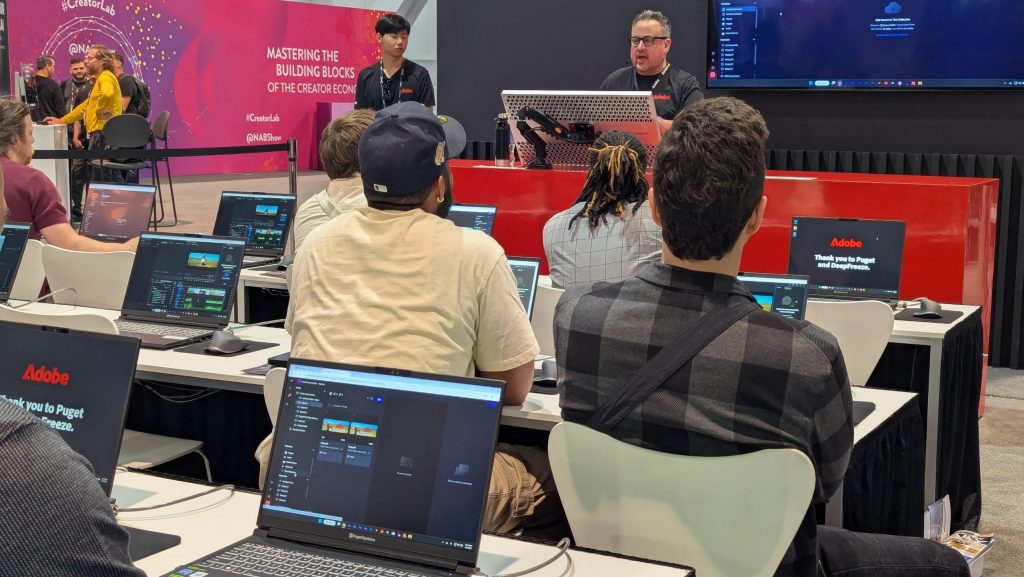 We were very excited to partner with Adobe this year to outfit the entire Creator Lab with our new Puget Mobile 16” laptops! Adobe organized sessions and workshops for attendees to test out new workflows, tips, and tricks. This also provided attendees a chance to try out the latest features being added to Premiere Pro and After Effects that leverage NVIDIA’s new Blackwell architecture in the NVIDIA GeForce 5090 Mobile, which powers our new Puget Mobile 16”.