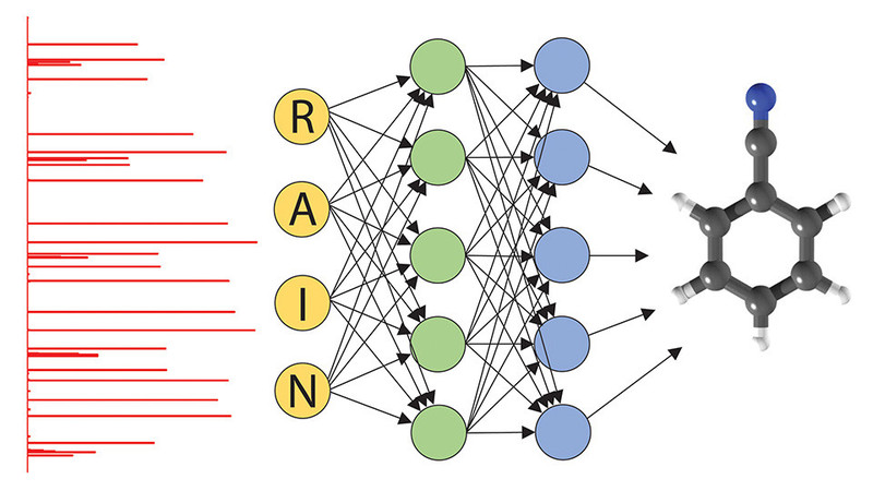 The concept of using artificial neural networks (middle) to convert rotational spectra (left) to molecular parameters (right). The Figure is reproduced from AIP Scilight, with the permission of AIP Publishing.