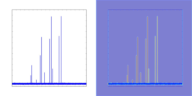An image of a rotational spectrum of a symmetric top molecule (left). A heat map representing the confidence level of the convolutional neural network that a certain pixel of the image belongs to a rotational line (right). The Figures are reproduced from the Journal of Chemical Physics, 149, 104106 (2018), with the permission of AIP Publishing.