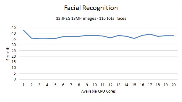 While there was a benefit to having two CPU cores, the benefit completely disappears after that point. In fact, we calculated the parallel efficiency to be just .2 (20%) which is pretty much nothing. In other words, the number of CPU cores you have is going to play almost no role in how long it takes Lightroom to detect faces in photos.