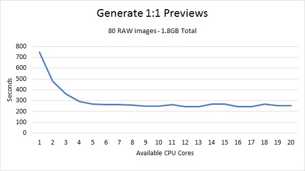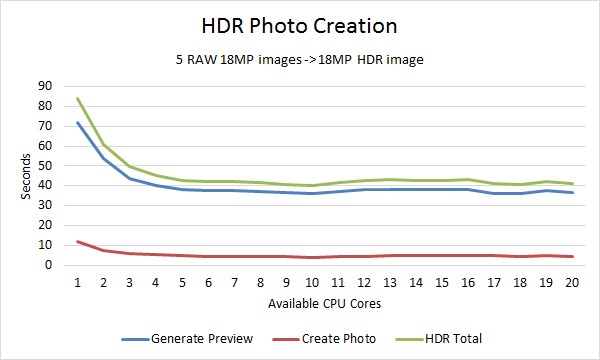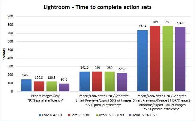 Once you start adding in other tasks like creating panorama or HDR photos, the balance shifts away from a high core count CPUs towards higher frequency CPUs. If you were to import your photos, convert them to DNG, generate Smart previews, create 8 HDR and 2 panoramas photos, then export only a handful of photos (say 10% of the total you imported) the overall parallel efficiency drops to about .57 (57%). At that point, the CPU that would give you the best overall performance would actually be the Intel Core i7 4790K 4.0GHz Quad Core 8MB 88W. This CPU only costs about $400 so in addition to being the fastest CPU for that use-case will also save you quite a bit of money which you could then spend on other aspects of the computer like faster storage or more RAM.