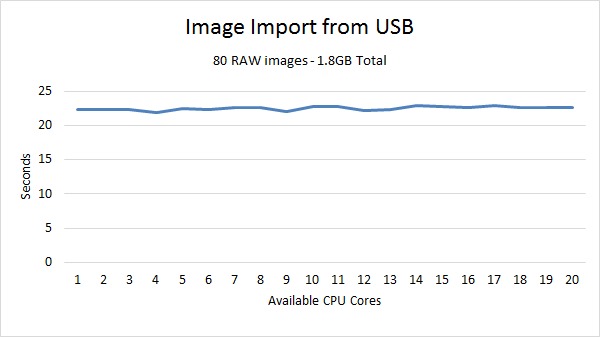 As you can see from the graph, the time it took to import our 80 RAW test images into Lightroom did not change at all based on the number of CPU cores available. However, this is the one action we tested where we do not believe the CPU was the main bottleneck. Instead, it appears that even with the fast Kingston USB 3.0 drive we used (which has a sequential read speed of about 120MB/s) the USB drive is what primarily limited performance. We are confident that importing is only single-threaded (we can determine that by watching the load % on each CPU core while importing the images), but using a CPU with a higher frequency is unlikely to improve the time it takes to import images unless you are comparing a very low-frequency CPU to a high-frequency CPU.