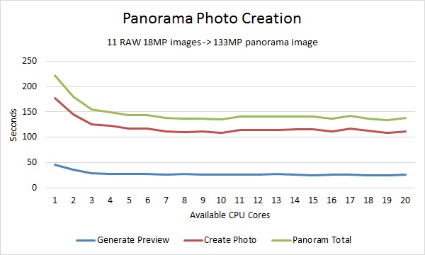 In this case, generating the preview (the blue line) is much faster than creating the panorama photo (the red line) which is exactly the opposite of what we saw with creating a HDR photo. Also, both these steps have a lower parallel efficiency than anything else we tested with the exception of importing images. Generating the preview had a parallel efficiency of about .47 (47%) while creating the photo was only about .41 (41%). Combining these two together results in an overall efficiency of only about .44 (44%) which means a CPU with a high operating frequency (as long as it has 2-3 cores) is going to give you the best performance when creating a panorama photo .