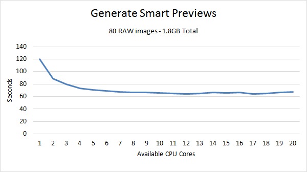 Unlike generating 1:1 previews, generating smart previews has a fairly low parallel efficiency of approximately .51 (51%). Again, we see no benefit from having a second CPU, although with this low of efficiency you are likely to hit the point of there being no measurable benefit to having that many CPU cores before you even think about needing a second CPU.