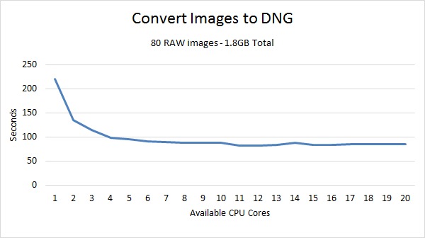 Converting to DNG definitely sees a benefit from having multiple CPU cores, but the efficiency is only about .69 (69%). Just like exporting images, the benefit from having more cores is greatly reduced once you start utilizing a second physical CPU. In this case, however, instead of just reducing the parallel efficiency we saw absolutely no benefit to having a second CPU.