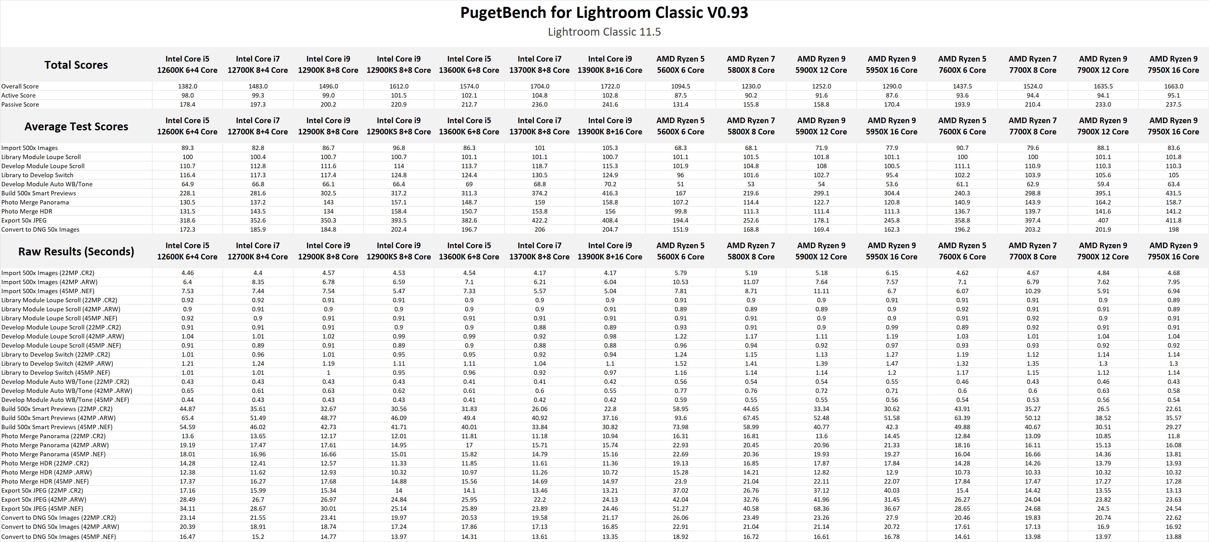 In this article, we will be using our PugetBench for Lightroom Classic 0.93 benchmark paired with Lightroom Classic 11.5 to examine the performance of the new Intel Core 13th Gen CPUs. As a comparison, we will be including the previous generation 12th Gen processors, as well as their primary competition – the AMD Ryzen 7000 Series. In addition, while we won't be calling out the results specifically in this article, the raw results table in the next section also includes the AMD Ryzen 5000 Series since Ryzen 7000 was only recently released.
