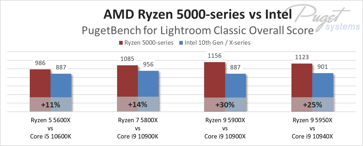 Overall, the new Ryzen 5000-series CPUs from AMD are terrific for Lightroom Classic. You can still get more overall performance from the (significantly) more expensive Threadripper processors, but the Ryzen 9 5900X, in particular, is not too far behind those beefier models.
