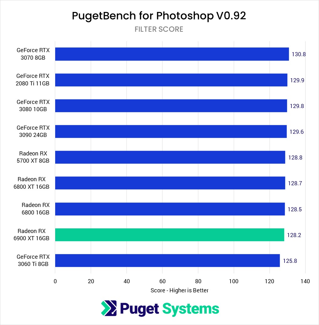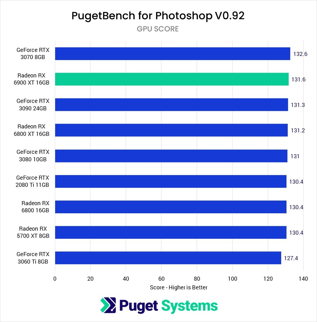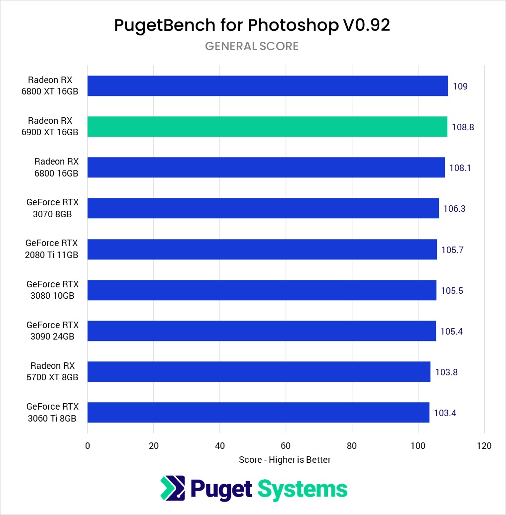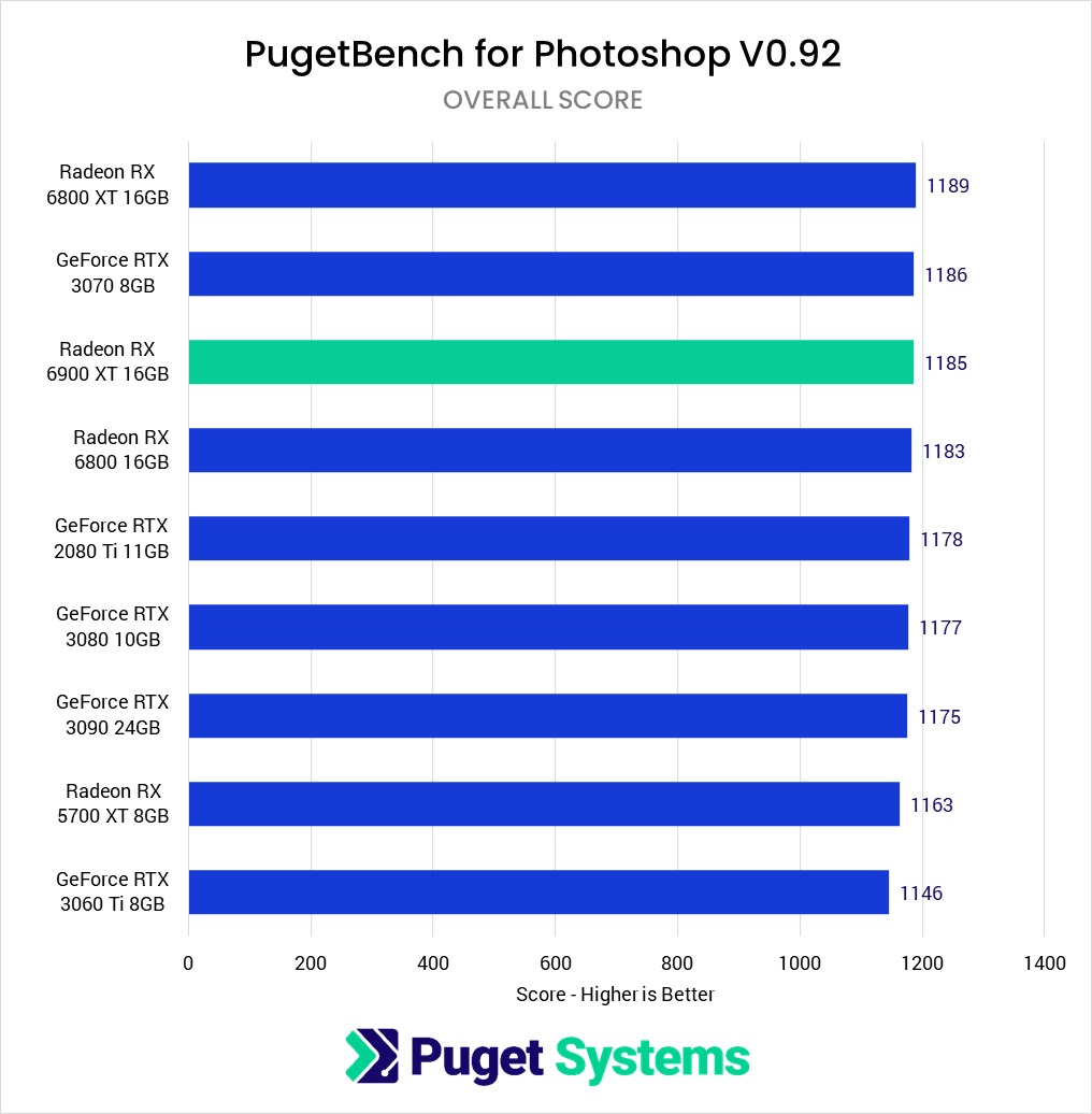 While the new AMD Radeon RX 6900 XT performs just fine in Photoshop, the GPU is a very low priority when designing a Photoshop workstation. It is very important to have a supported GPU, but all the cards we tested performed within the margin of error for our benchmark, so there is no reason to invest in a higher-end GPU for Photoshop. So, while the 6900 XT performs just fine in Photoshop, you might as well save your money and get something like a GeForce RTX 3060 Ti or Radeon 5700 XT and spend the savings on a more powerful CPU.
