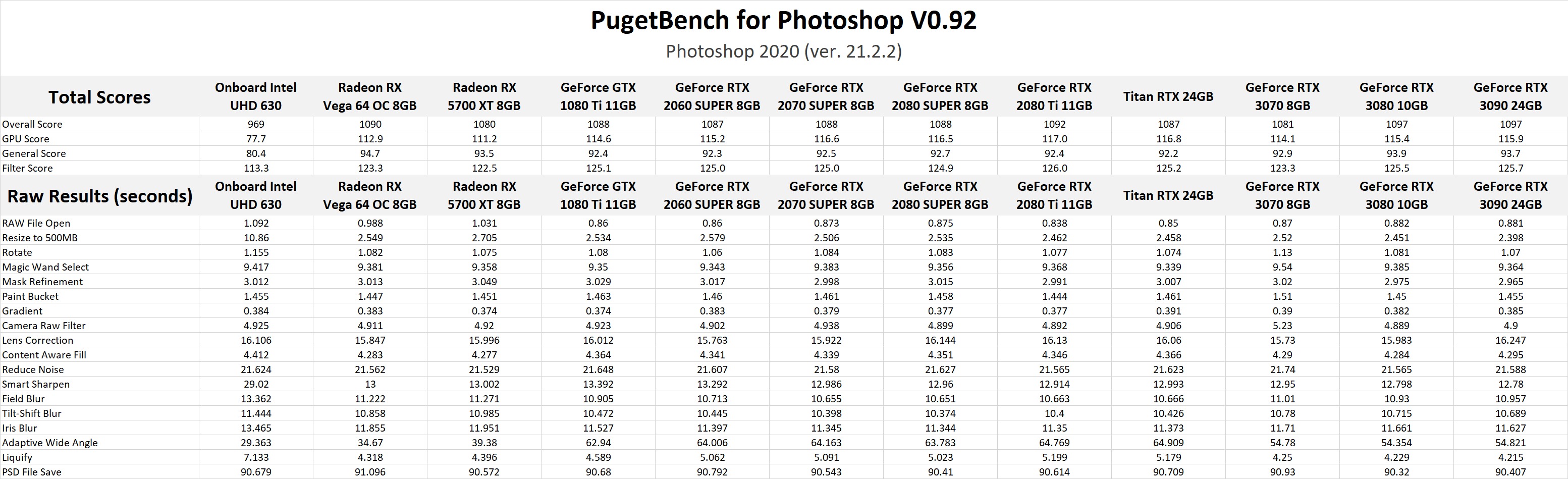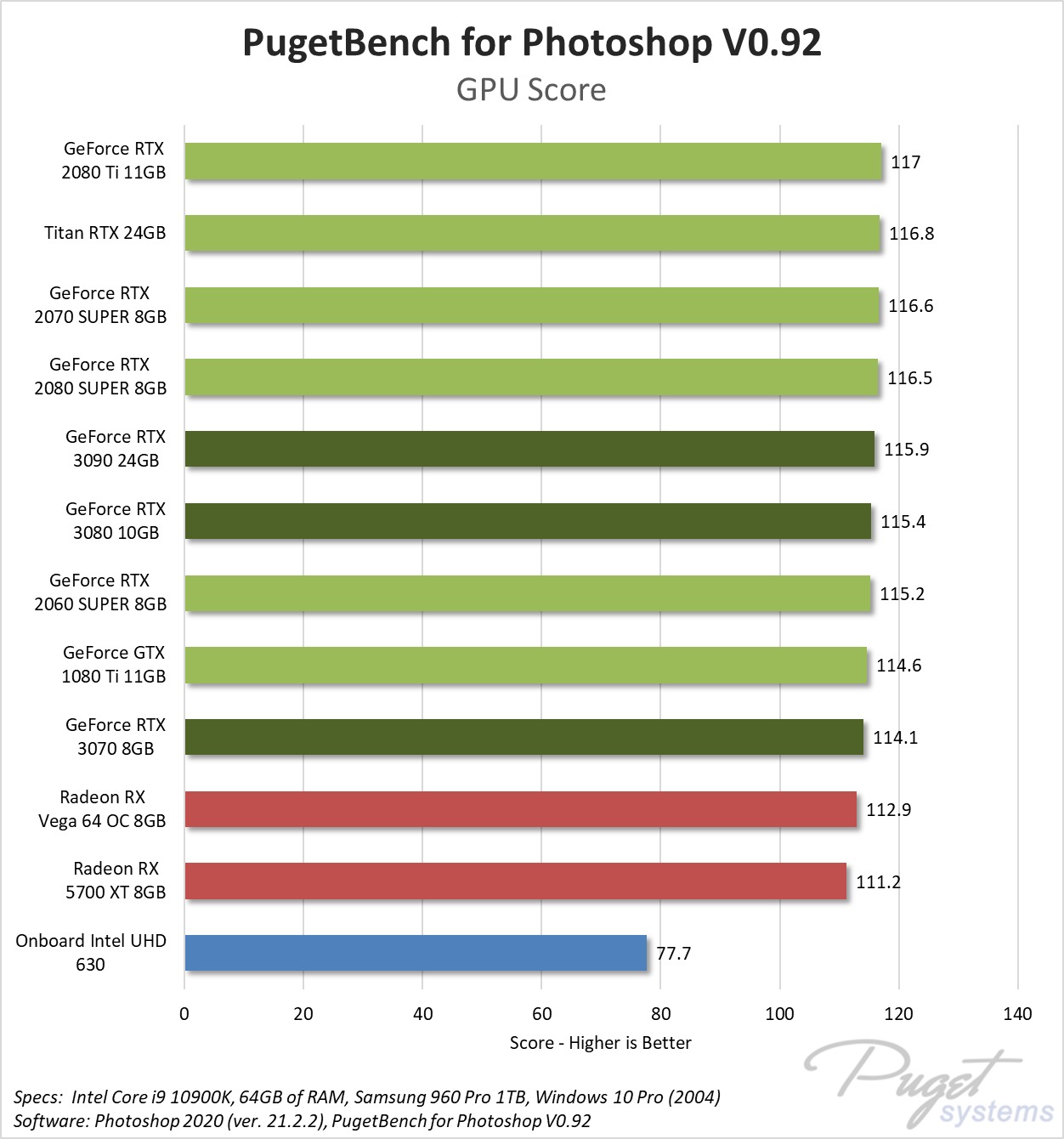 Although Photoshop has a number of GPU-accelerated effects that make it important to have a supported GPU, there is effectively no difference in performance between the various NVIDIA and AMD GPUs we tested. Having a GPU can give you up to a 50% boost in performance, but the new NVIDIA GeForce RTX 3070 8GB, 3080 10GB and RTX 3090 24GB are no faster than the RTX 2080 Ti, not to mention the RTX 2060 SUPER or even the older GTX 1080 Ti.
