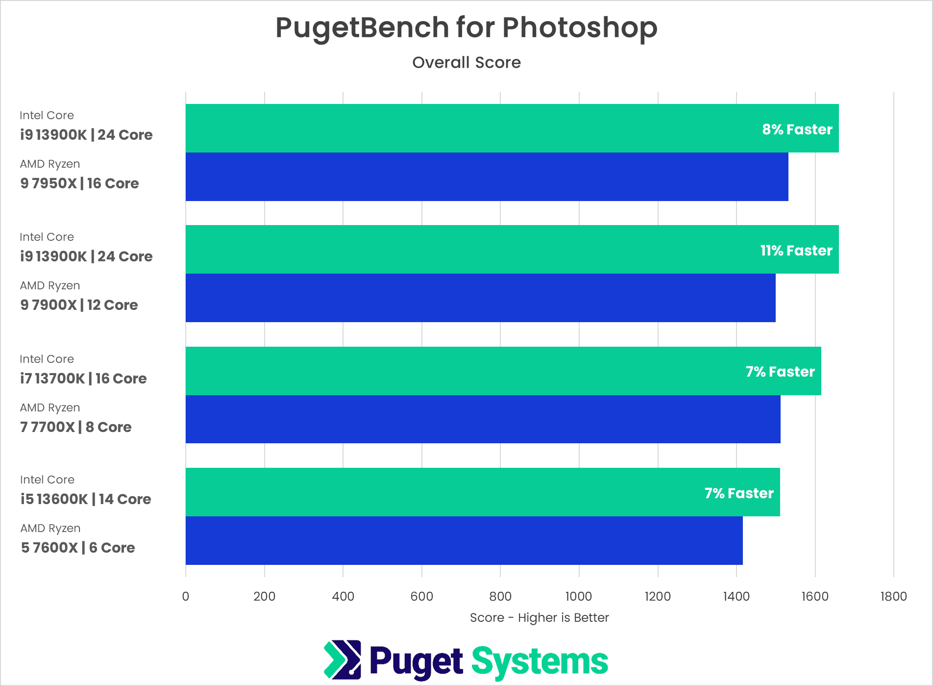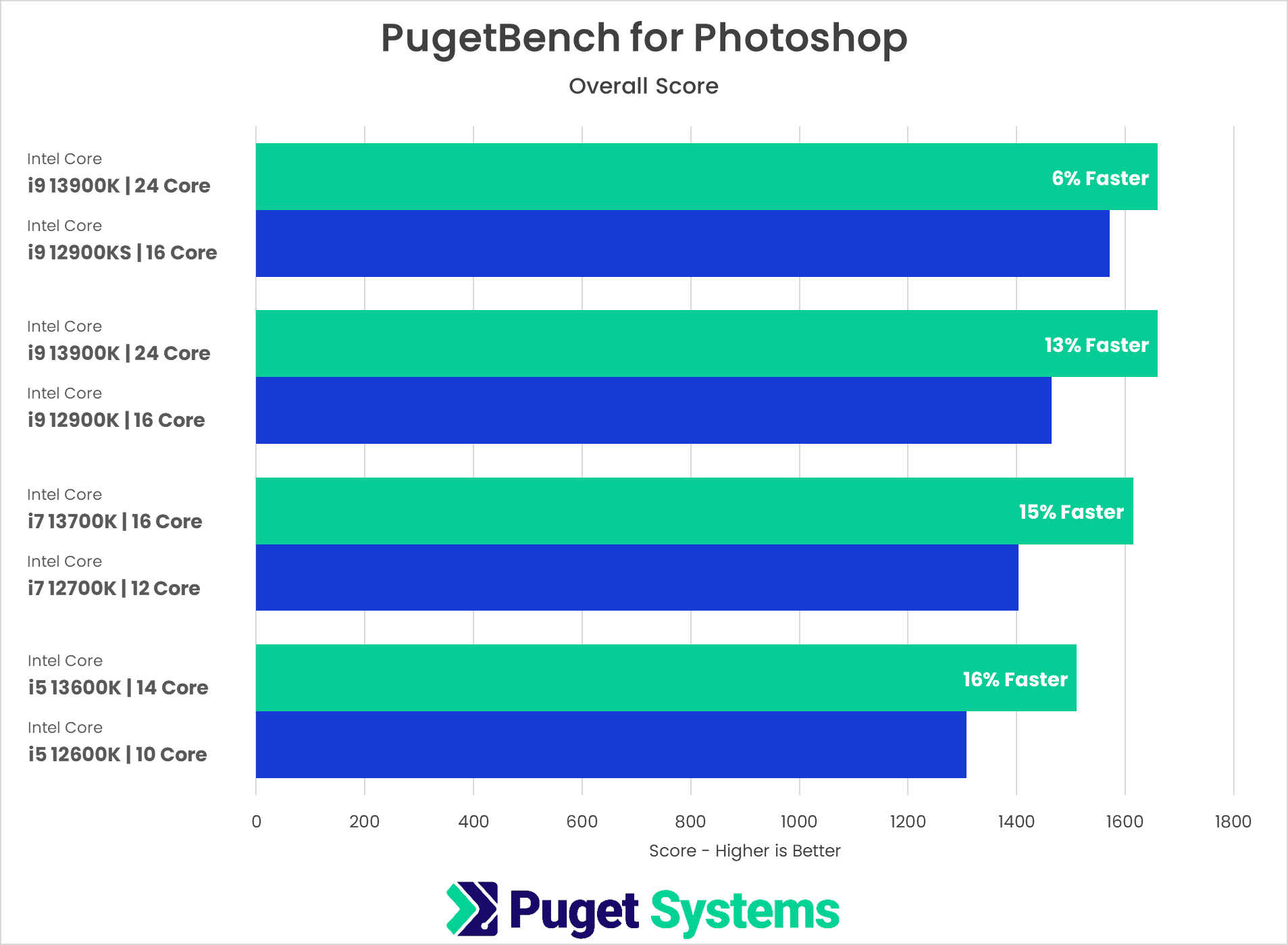 The new 13th Gen Intel Core processors do very well in Photoshop, showing a solid 13-23% performance gain versus the 12th Gen CPUs they are replacing.