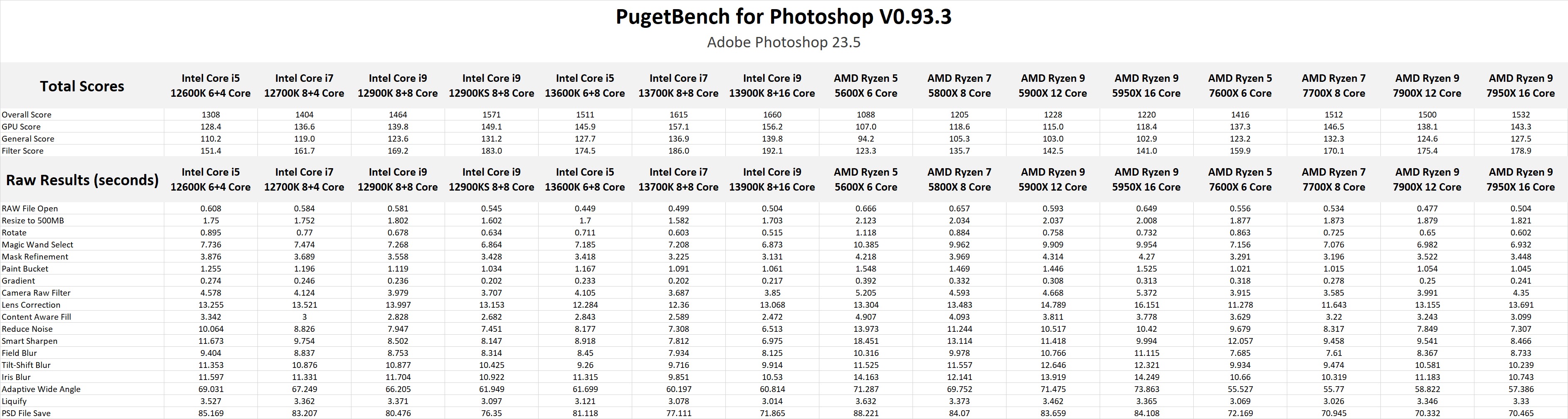 In this article, we will be using our PugetBench for Photoshop 0.93.3 benchmark paired with Photoshop 23.5 to examine the performance of the new Intel Core 13th Gen CPUs. As a comparison, we will be including the previous generation 12th Gen processors, as well as their primary competition – the AMD Ryzen 7000 Series. In addition, while we won’t be calling out the results specifically in this article, the raw results table in the next section also includes the AMD Ryzen 5000 Series since Ryzen 7000 was only recently released.