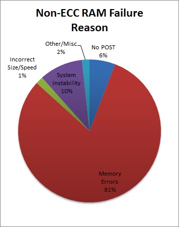 The failures for non-ECC RAM, on the other hand, are overwhelmingly caused by memory errors. In fact, only 9% of the failures (No post, other/misc, and incorrect size/speed) were the type of failures that would not put your data at risk. The other 91% of failures were the type that you absolutely do not want to see in a server or other system that contains valuable data.