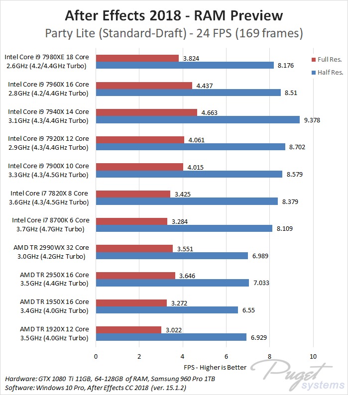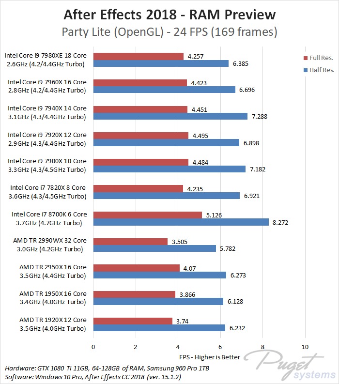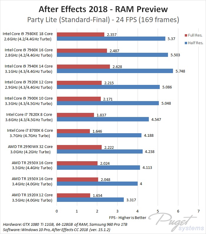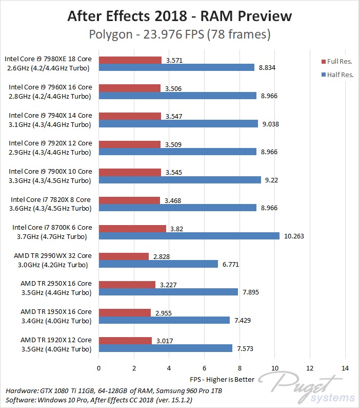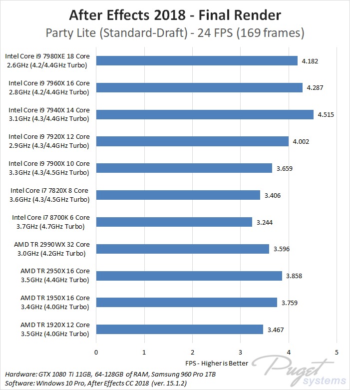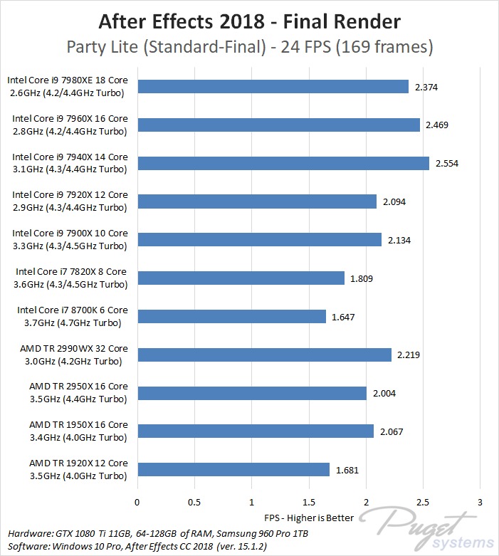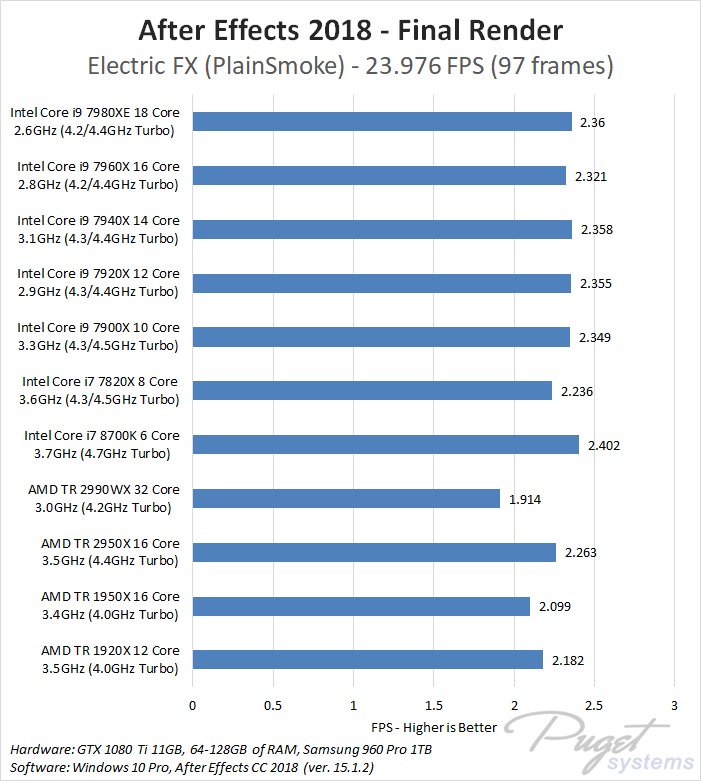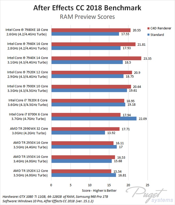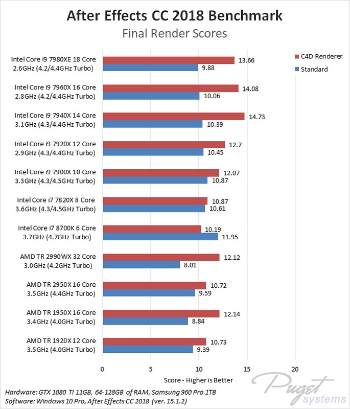 Overall, the i9 7980XE scored about 20% higher than the 2990WX in our After Effects CC benchmark. However, standard projects were about 25% faster with the i9 7980XE while projects utilizing the C4D rendering engine were only about 15% faster than the 2990WX.