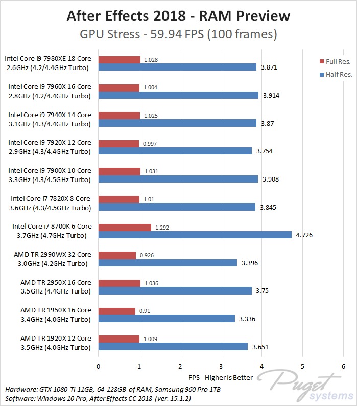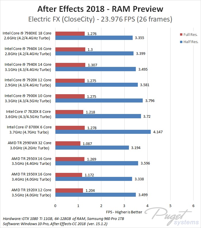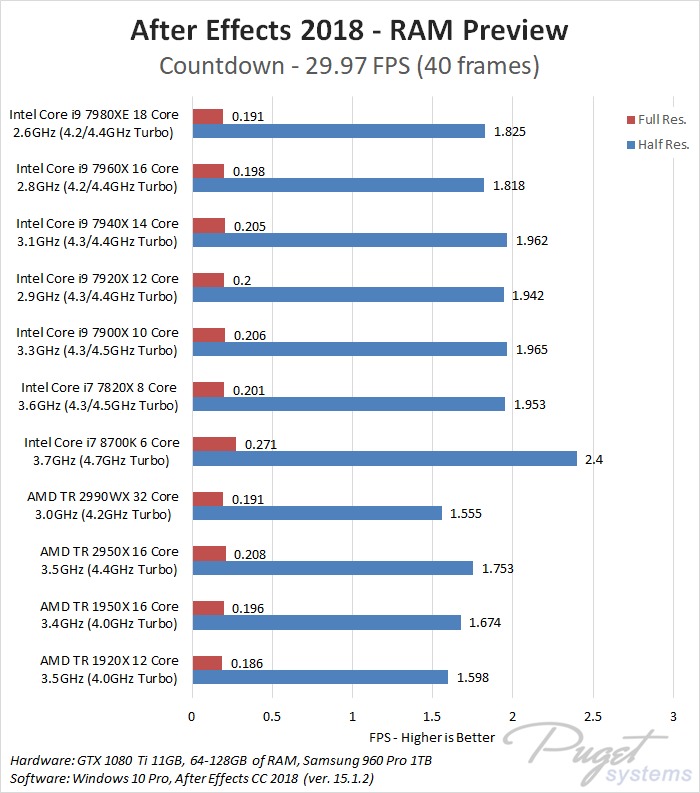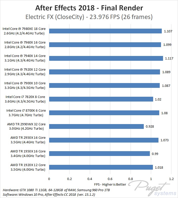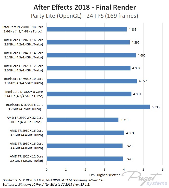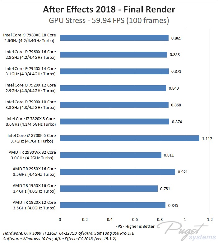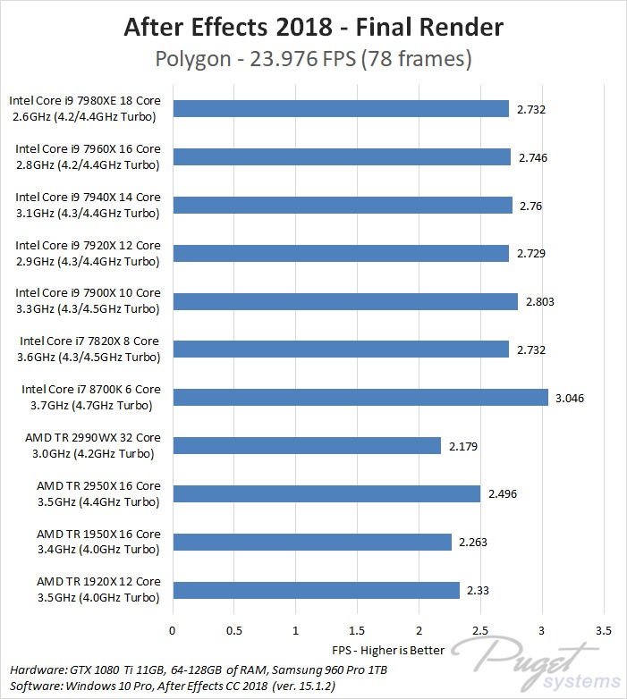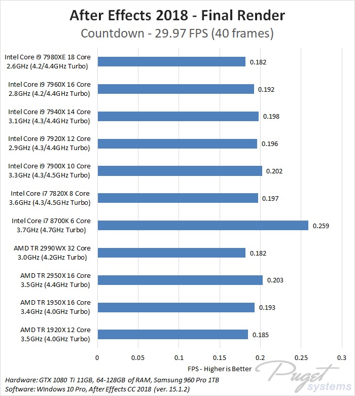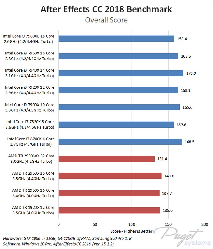 After Effects favors CPUs with higher per-clock performance which is unfortunately a weakness of AMD's Threadripper CPUs. For most users, a Threadripper 2990WX and 2950X CPU should be about 30-40% slower than a much more affordable Core i7 8700K. They did better when utilizing the C4D rendering engine, but even there they were not able to match a similarly priced Intel X-series processor.