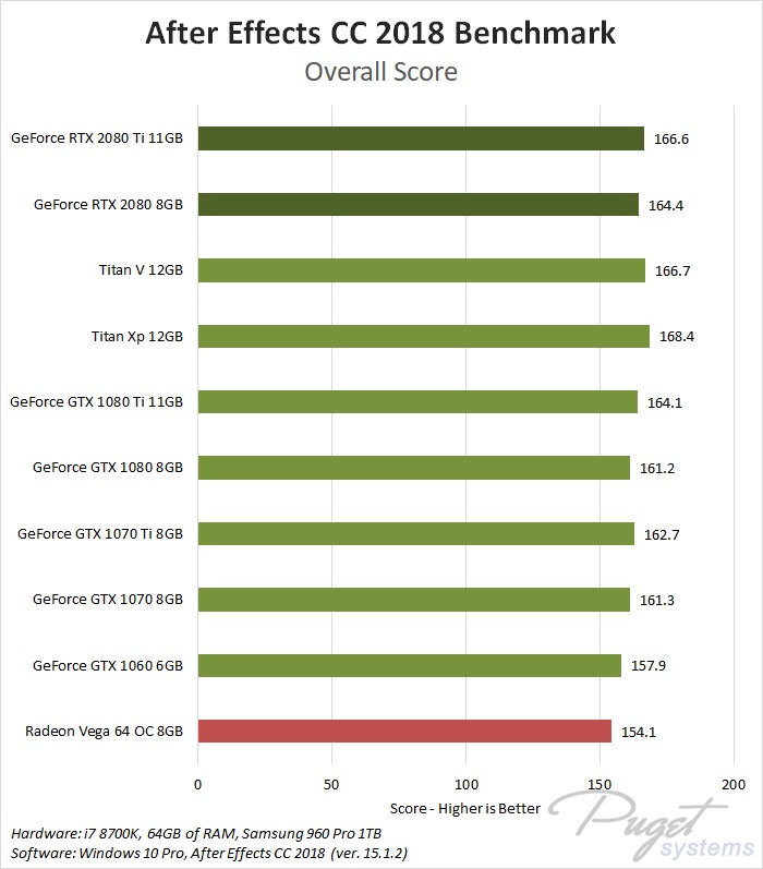 To see how the new RTX cards perform in After Effects, we tested it against a selection of cards from NVIDIA as well as AMD's Vega 64 GPU.