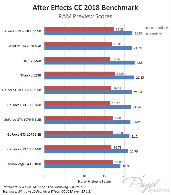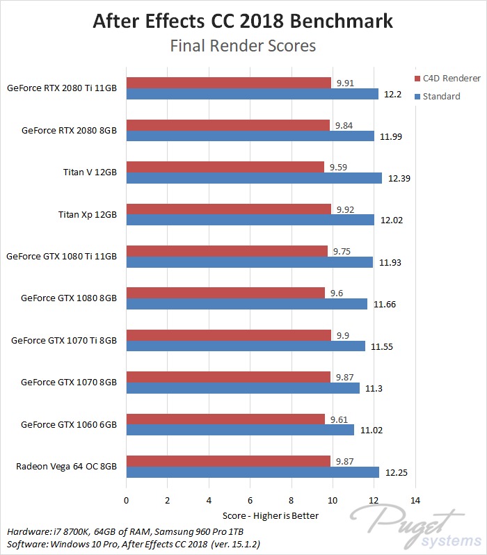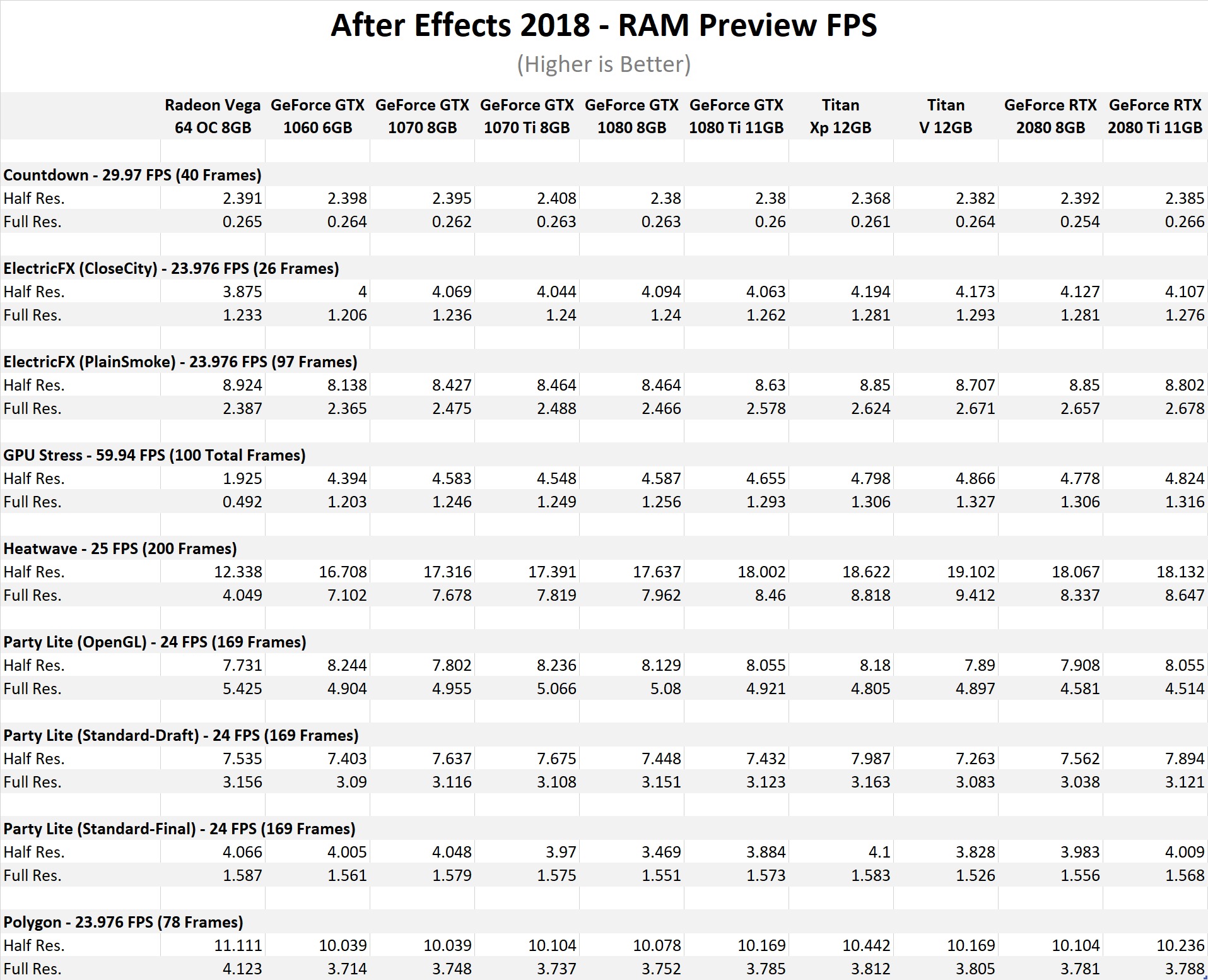 Overall, while not really necessary for After Effects alone, if you already need a new high-end GPU for other applications (Premiere Pro, GPU-based rendering, etc.) we would recommend using one of these RTX cards if possible. The RTX 2080 does have less VRAM than the comparably priced GTX 1080 Ti (8GB vs 11GB), but the potential these cards offer for the future is likely worth investing in.