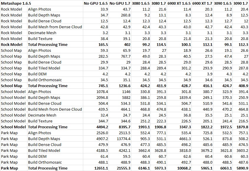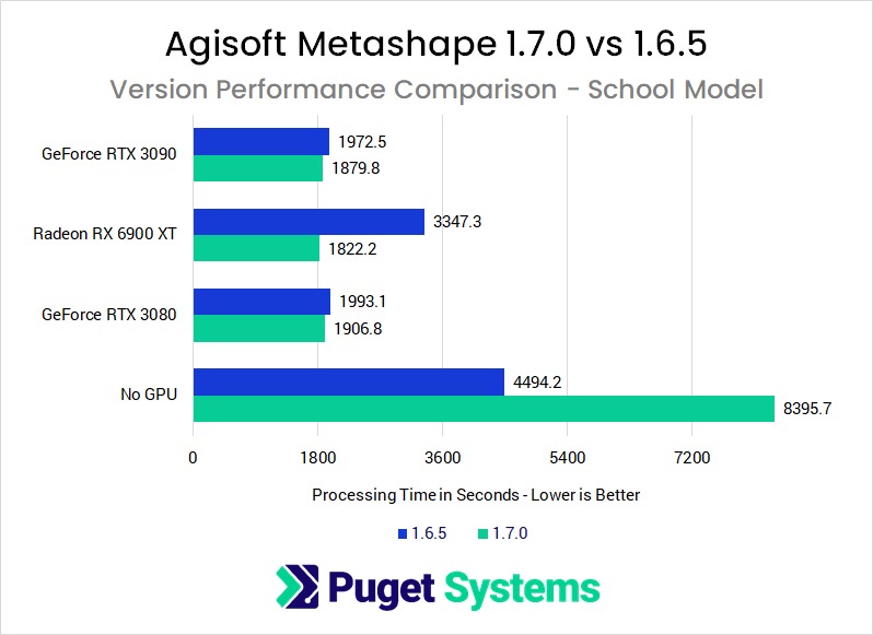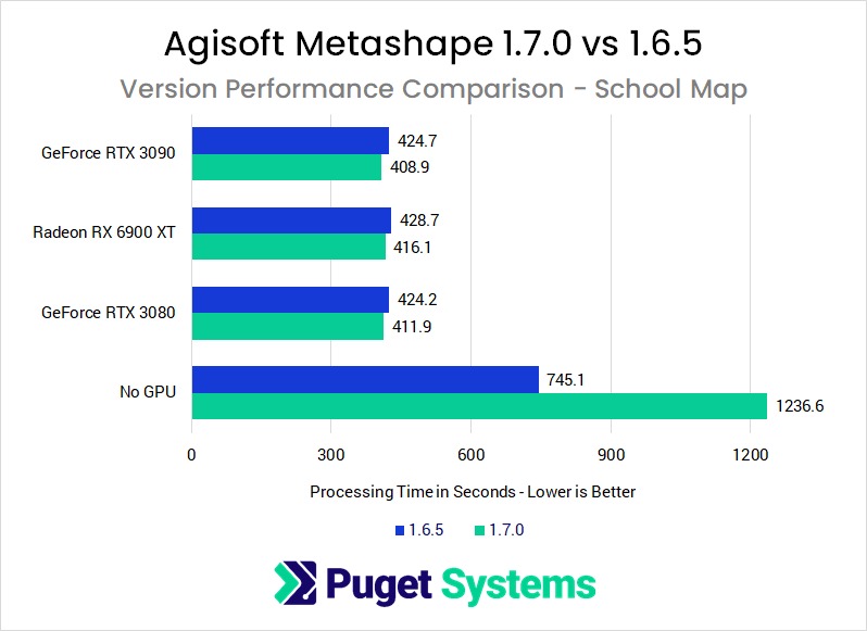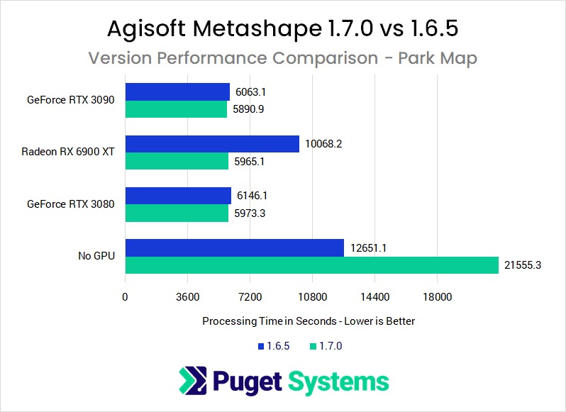 We just published a big GPU roundup for Metashape 1.6.5, covering all of the GeForce RTX 30 Series and Radeon RX 6000 Series video cards that have been released so far, but while we were waiting on a 6900 XT to test, the folks at Agisoft launched a new version of Metashape: 1.7.0. It had been in beta for a while, but was fully released on New Years Eve. So, after publishing our 1.6.5 results, we turned around and immediately began testing the new version to see if performance has changed. Read on to see what we discovered!