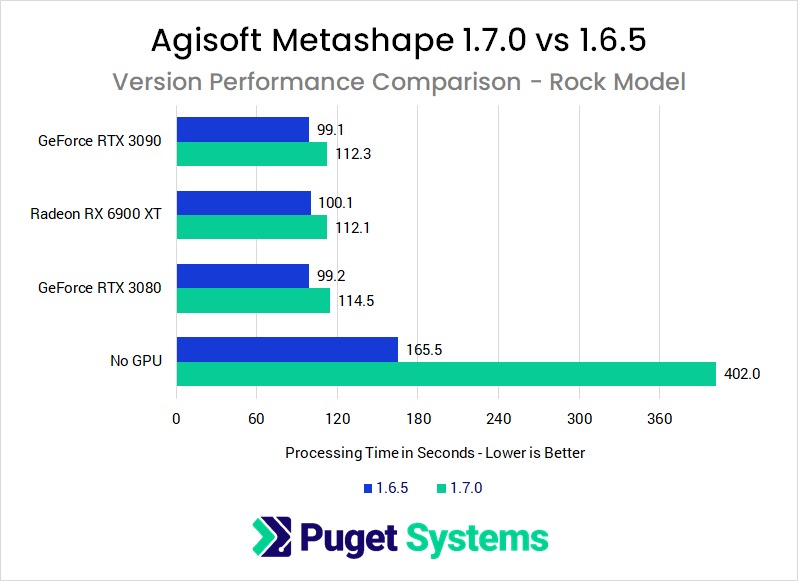 In version 1.7.0, Agisoft appears to have fixed whatever was holding back the performance of AMD's Radeon video cards. Now, both the GeForce RTX 30 Series and Radeon RX 6000 Series cards give great results, and overall the processing times are slightly better compared to 1.6.5 (except for in our smallest project, which was a little slower). If you are using an AMD video card, you will definitely want to update to the newest version - and unless you work exclusively on small jobs with fewer than 50 photos, NVIDIA based systems will see a boost with Metashape 1.7.0 as well.