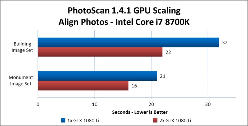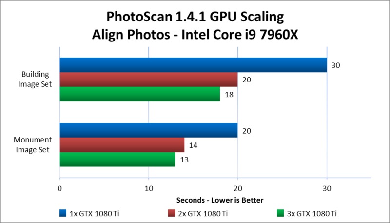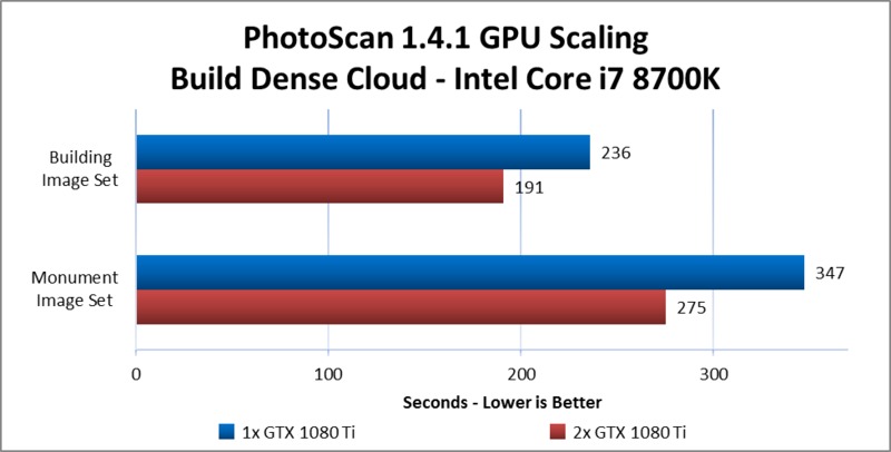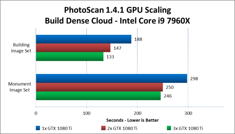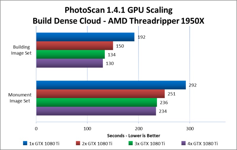 PhotoScan makes use of the video cards in a computer to assist with the computation of certain steps. As such, both the model of video card used and the number of them present in a system can have an impact on the amount of time those steps take. In this article, we take a look at how multiple GeForce GTX 1080 Ti cards scale in performance across a few CPU platforms – different chipsets supporting up to 2, 3, or 4 GPUs.