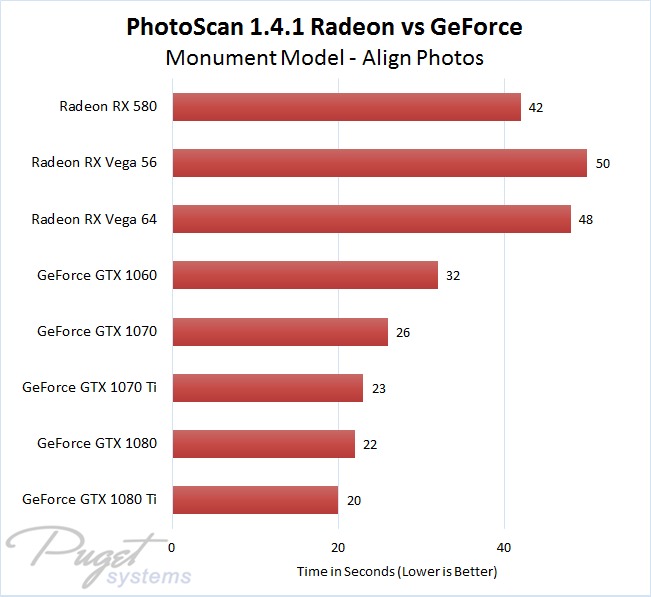 PhotoScan makes use of the video card in a computer to assist with the computation of certain steps. The primary GPU accelerated steps are aligning photos and building a dense point cloud (a 3D representation of physical points that are seen from multiple angles in different photos). Because the video card plays a big role in these calculations, the model of video card (or GPU) used can have an impact on the amount of time those steps take. In this article, we are taking a look at AMD's Radeon line of video cards – including the Vega 56 & 64 – to see how they compare to NVIDIA's GeForce 1000-series.