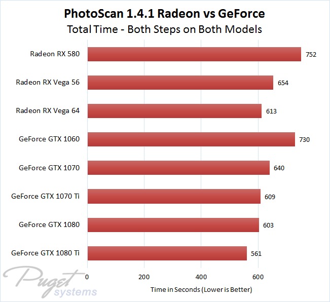 One thing to keep in mind with the results shown above is that we did our tests at "High" quality. There is an option above that for building the dense cloud, "Ultra High", which will take substantially longer. Given the Radeon cards' strong showing in that portion of the test, it is possible they would pull ahead of some of the GeForce models. The GTX 1080 Ti, though, is still the fastest from among the cards we tested – and if you are spending hours per image set on Ultra High quality, it is probably well worth spending extra for that GPU.