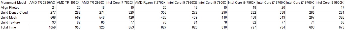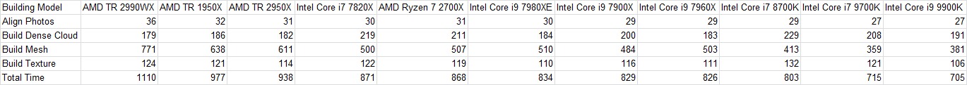 In previous roundups, all of the Intel processors came in fairly close to each other – but these new 9th Gen Core Processors are at least 10-15% faster than the other CPUs we tested in PhotoScan. Clock speed is probably the driving factor, though having more cores than the older i7 8700K may also help in some steps.
