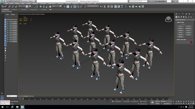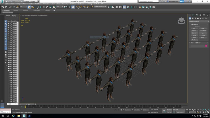 Starting with our animation testing, we used three scenes taken from the 3ds Max 2016 Tutorial files and 3ds Max 2017 samples files. These scenes cover basic character animation, particle flow, and animations with population simulations.