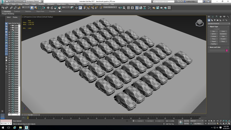To help with consistency – and since the benchmarks we performed ran for several days – we programmed a custom script using AutoIt to start 3ds Max, load the relevant project, change the view mode (wireframe, shaded, shaded w/ edged faces), then run a MAXScript to perform the different tests. We will be testing with a variety of scenes and models that should give us a range of different poly and vert counts, along with features such as animations, high resolution textures, and simulations: