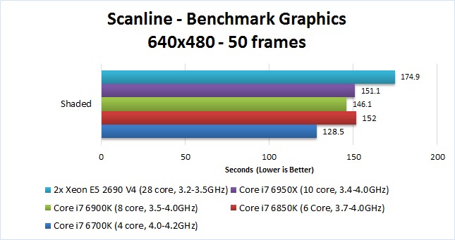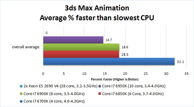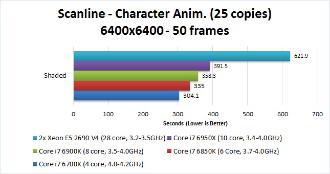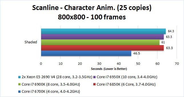 Looking at the other CPUs, the results for both animation and scanline rendering were pretty much what we expected. These tasks greatly value a CPU with a high frequency, so the faster single-core performance of the Core i7 6700K and it's overall newer architecture gives it a great performance boost over the other CPUs. Interestingly, the 6 and 8 core i7 CPUs (6850K and 6900K) were faster than the 10 core i7 (6950X) even though all three of these CPUs have a maximum Turbo Boost frequency of 4.0GHz when only a single core is in use. This suggests that animation and rendering are able to utilize more than a single core, although it is obvious that they cannot effectively use more than 4 cores since the i7 6700K quad core CPU was the best.