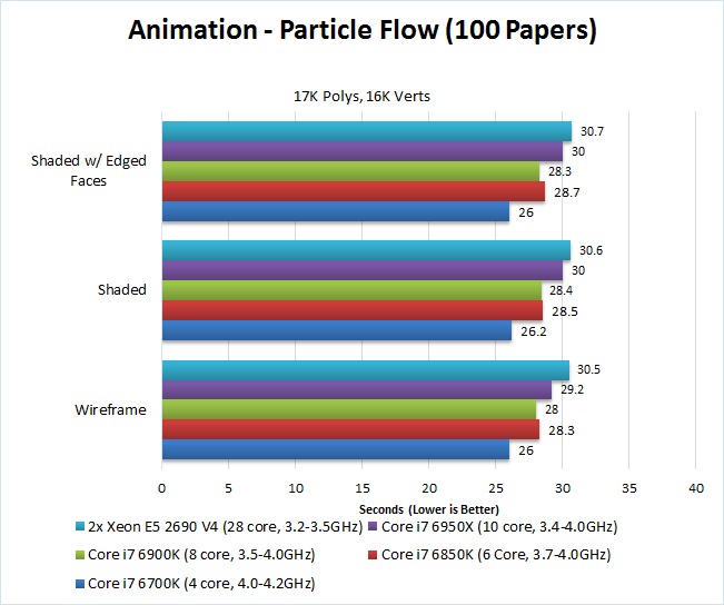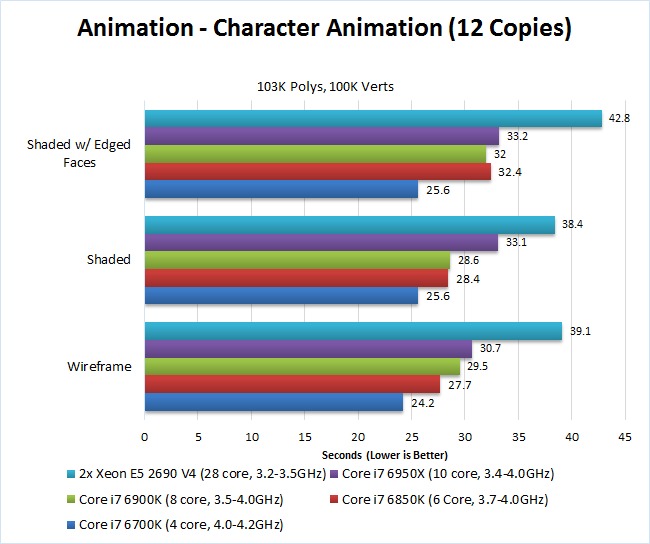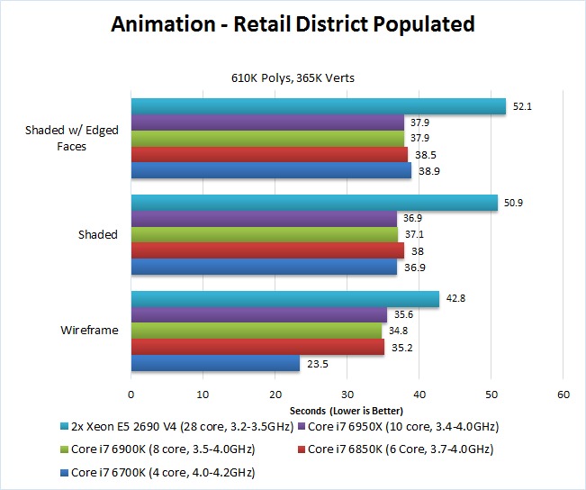 While the exact difference between each CPU varies based on the scene and the view mode, the two things that are very clear is that the Core i7 6700K is by far the fastest CPU – about 32% faster than the dual Xeon E5-2690 V4 CPUs. Interestingly, even though the other Core i7 CPUs all have the same maximum Turbo frequency, the 10 core i7 6950X was actually a bit slower than the 6 and 8 core Core i7 CPU. This suggests that while animations can't take advantage of a large number of CPU cores, it can still use a handful of them which is why the lower core count i7s (which have a higher minimum Turbo Boost frequency) were the fastest.