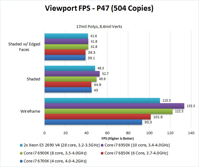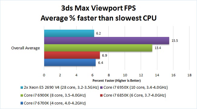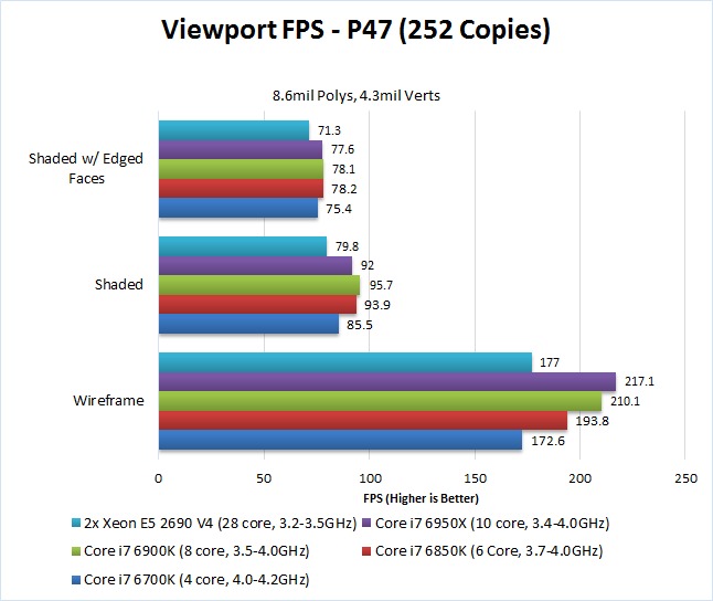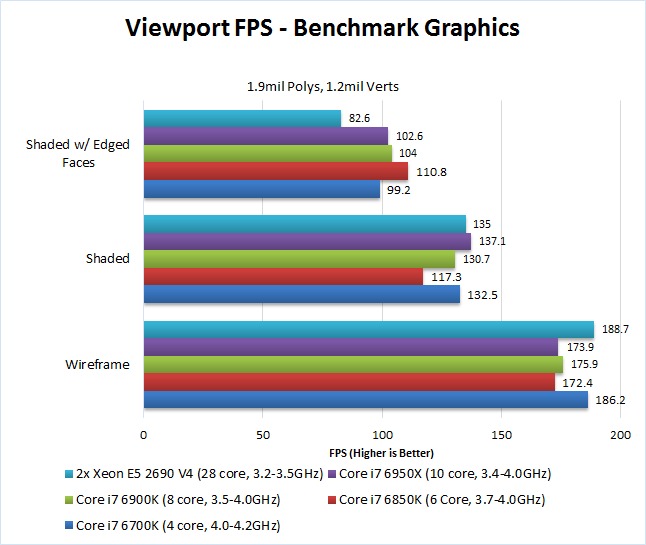 These results are a bit unusual for us to see as the Core i7 6700K tends to do better on FPS benchmarks due to it's newer architecture. But for whatever reason, the Core i7 6950X (which was the second worst performing CPU for animations) handily takes the crown for being the best for viewport FPS.