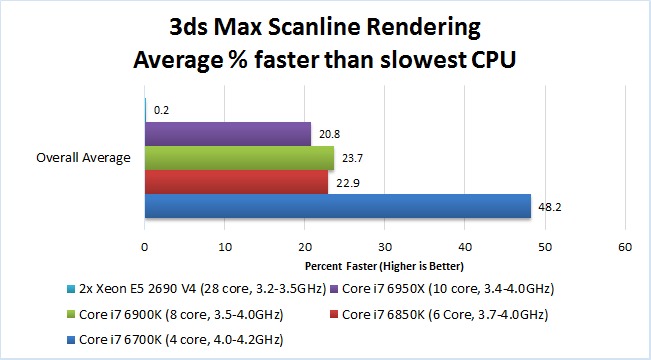These CPU choices cover the spectrum of what we might consider selling in a 3Ds Max workstation. The Core i7 6700K is the highest-end standard Core i7 CPU from Intel and has among the fastest single-core performance of any CPU currently available. The three other Core i7 CPUs (6850K, 6900K, and 6950X) are all from Intel's "High End Desktop" line and have a higher core count than the standard Core i7 CPUs (between six and ten cores). In addition, these CPUs are capable of running a single core at speeds up to 4.0GHz which should give them close to the single-core speed of the 6700K. However, since they are technically one architecture older than the Core i7 6700K (Broadwell vs Skylake), the 6700K should theoretically still be about 10-15% faster for single-threaded tasks.