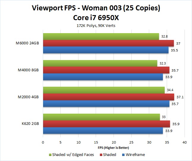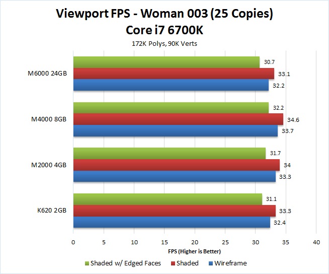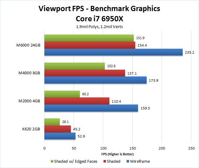 For Shaded and Shaded w/ Edged Faces, we saw a huge jump in performance – more than double – going from the K620 to the M2000. We saw a further 30-40% increase in performance going up the the Quadro M4000, although there was almost no difference between the M4000 and the highest-end Quadro M6000.
