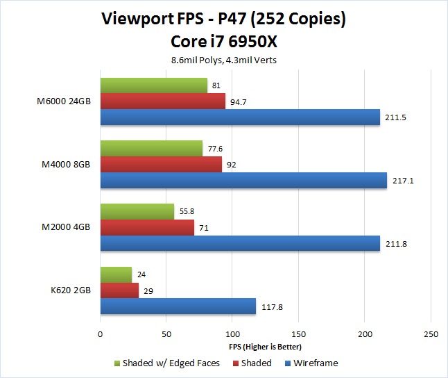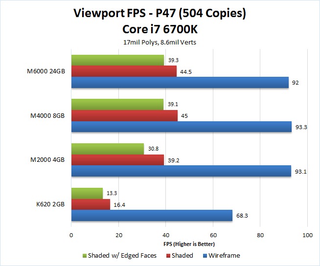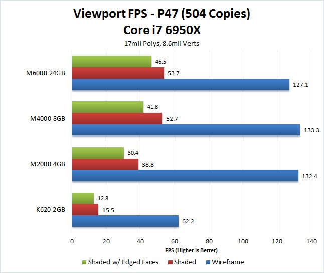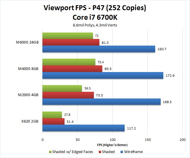 Doubling the number of copies of the P47 model is a quick and easy way for us to test a large number of polys and verts. Interestingly, while the raw results are lower than the previous test, the relative performance between each card is actually very similar. Once again, the K620 is the lowest performing by a large margin with the M2000 being more than twice as fast. In addition, we again saw very little difference in performance between the Quadro M4000 and the Quadro M6000.