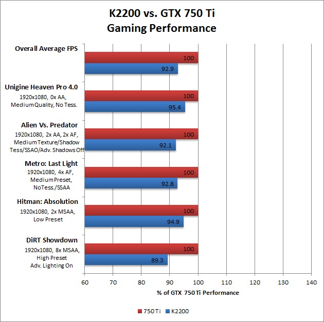 In terms of theoretical performance the Quadro K2200 should be about 2.5% faster than the GTX 750 Ti. However, in reality it turns out that the K2200 is on average about 7% slower than the GTX 750 Ti. The exact amount depends on the game and ranges anywhere from 4.6% (Unigine Heaven Pro 4.0) to 10.7% (DiRT Showdown).