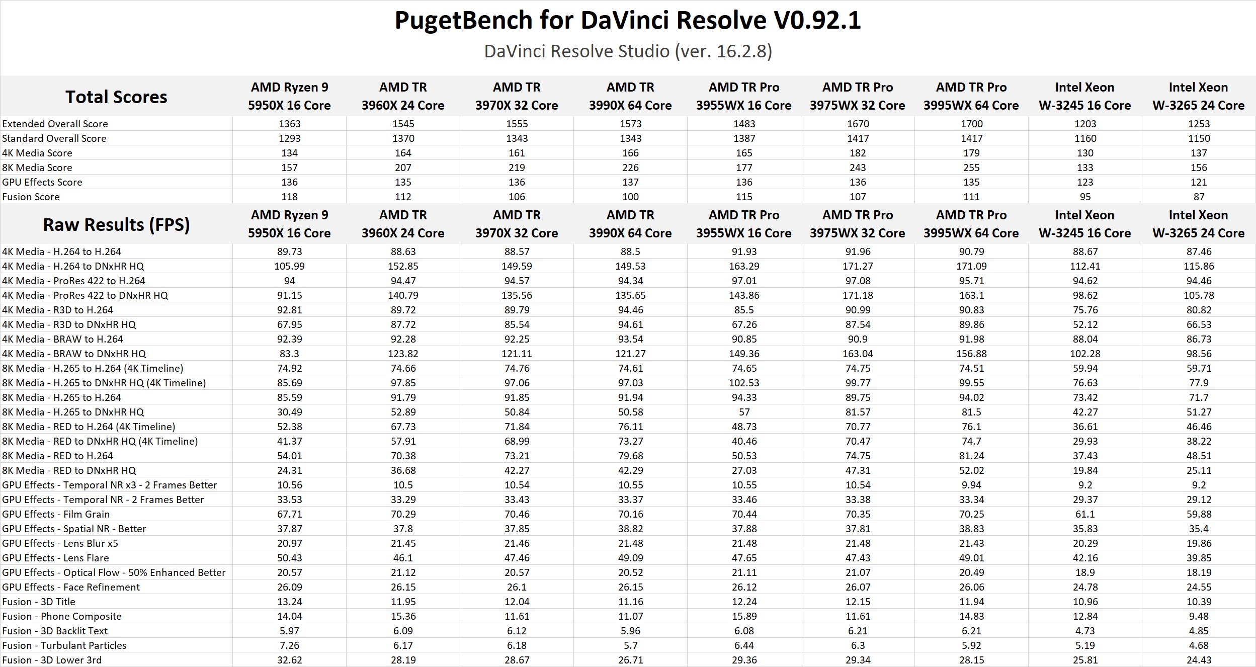 In actuality, Threadripper Pro does very well in DaVinci Resolve, with the TR Pro 3995WX 64 Core and 3975WX 32 Core scoring about 8% higher than the 3990X 64 Core and 3970X 32 Core respectively. The 3955WX 16 Core did perform a bit under the Threadripper 3960X 24 Core, although that is to be expected as it is less expensive than the 3960X and has fewer CPU cores. The 3955WX did do well versus the Ryzen 5950X (which has the same number of cores), however, scoring about 9% higher overall.