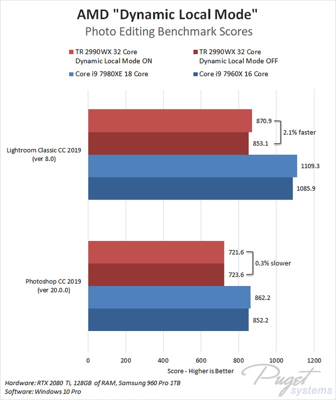 AMD's solution to this is a new setting in the Ryzen Master software called "Local Dynamic Mode". You can read more about it is AMD's blog post Previewing Dynamic Local Mode for the AMD Ryzen™ Threadripper WX Series Processors, but the short of it is that this setting will attempt to prioritize the cores that have direct access to your system memory. In theory, this should increase performance in applications that cannot take full advantage of the high core counts of these CPUs, so we wanted to see exactly how well it works in photo editing applications like Lightroom Classic and Photoshop.