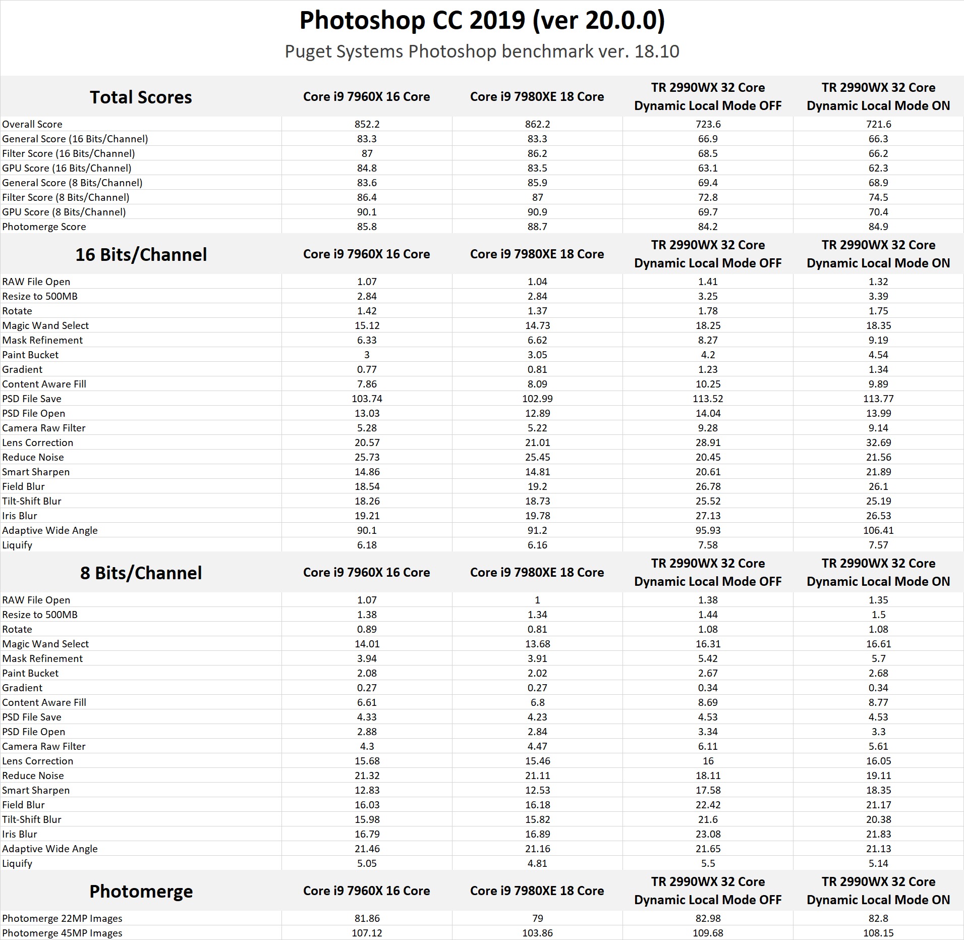 We are primarily concerned with the performance of the AMD Threadripper 2990WX with Local Dynamic Mode both on and off, but we decided to also include the Intel Core i9 7960X and 7980XE. We are doing this since Intel tends to have the performance lead right now for photo editing, and this way we will be able to see if any performance gain via Local Dynamic Mode is enough to make AMD Threadripper faster than Intel X-series. Note that none of these CPUs are going to be the best for these applications, that crown goes to the Core i9 9900K as you can see in our recent articles for both Lightroom and Photoshop.