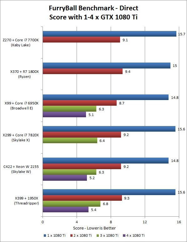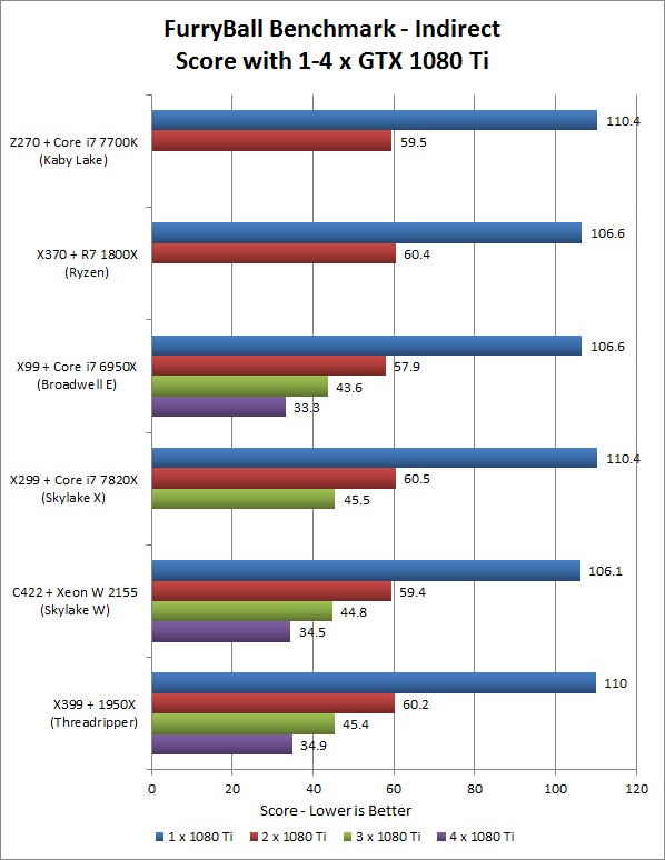 The main takeaway here is that the platform does not make any substantial impact on performance. There is a small amount of variance, with less than a 10% spread, but that is not much in the grand scheme of things. Any of these platforms will do well with multi-GPU rendering in FurryBall, though keep in mind that the chipset and motherboard will determine the total number of video cards you can use.