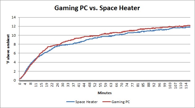 As you can see from the chart above, the gaming PC and space heater performed very close to each other. The times when the gaming PC pulled ahead were when the wattage draw of the PC climbed a bit higher than the space heater before we could manually adjust it down. We tweaked the video card power settings every 20 minutes, but due to how often the fans decided to ramp up or down the results were not quite as straight forward as the space heater results.