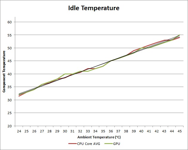 Surprisingly, even with CPU and GPU fan throttling enabled, our results are very linear. At first glance, it appears that the CPU and GPU temperature at idle increases by about 1° C for every 1° C rise in ambient temperature. By applying a trendline with Excel (shown as black lines on the graph), we found that the slope for the CPU is actually 1.0469x, while the slope for the GPU is 1.0824x. In other words, a 1° C rise in ambient temperature results in roughly a 1.05° C increase in CPU temperature and a 1.08° C increase in GPU temperature when the system is at idle.